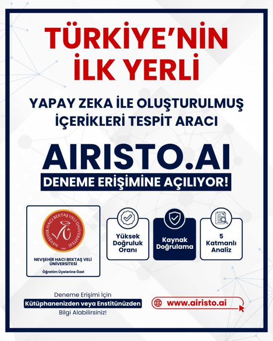 - Yapay zekâ içerik tespit aracı Airisto Ai 31 Ekim 2025 tarihine kadar üniversitemiz deneme erişimine açılmıştır.