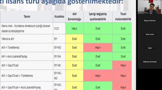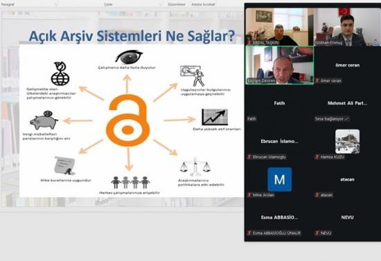 Eğitim toplantımızda, Üniversitemiz Akademik Arşiv Sistemi (DSpace) tanıtımı, kullanımı ve veri girişinde dikkat edilmesi gereken hususlar anlatılmış, ayrıca Açık Bilim ve Açık Erişim Komisyonumuzun çalışmaları ile telif hakları konuları değerlendirilmiştir.