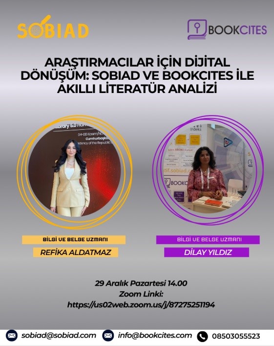 - Sobiad Atıf Dizini tarafından ''Araştırmacılar İçin Dijital Dönüşüm: SOBIAD&BookCites ile Akıllı Literatür Analizi'' webinarı düzenlenecektir.