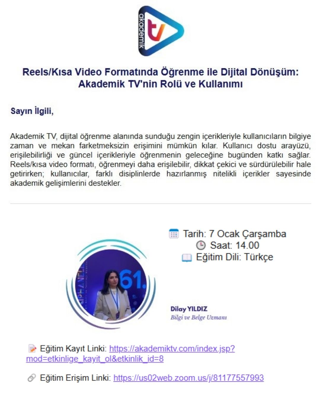 07 Ocak Çarşamba Günü, Saat: 14:00'da, Reels / Kısa Video Formatında Öğrenme ile Dijital Dönüşüm: Akademik TV'nin Rolü ve Kullanımı Eğitimi gerçekleştirilecektir.