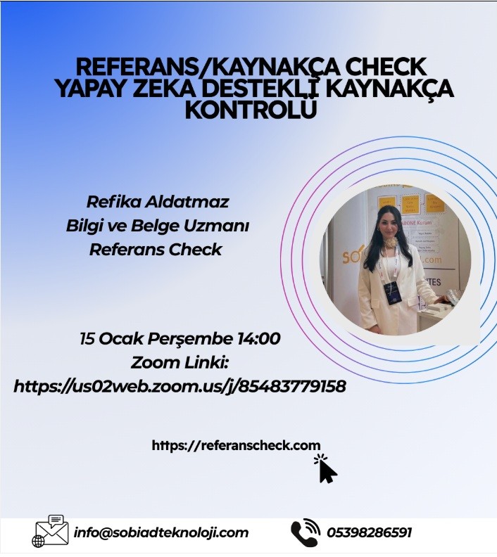 15 Ocak Perşembe günü ''Referans/Kaynakça Check Yapay Zeka Destekli Kaynakça Kontrolü'' sunumlu eğitim gerçekleştirilecektir.
